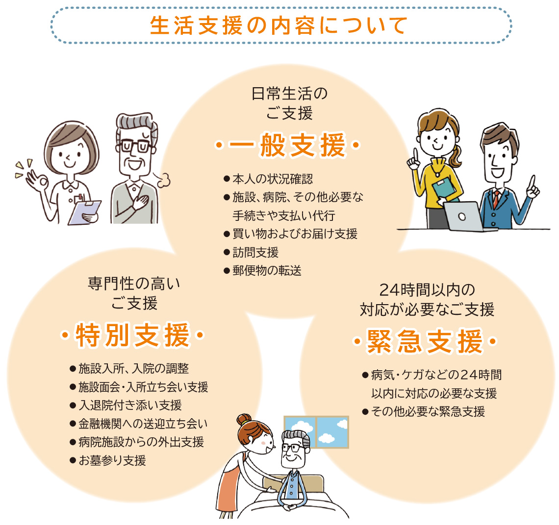 公共料金のお支払いやお墓参りの同行など、日常生活でサポートが必要な際には電話一本でお手伝いに向かいます。 生活支援の内容について日常生活のご支援専門性の高いご支援 24時間以内の対応が必要なご支援・一般支援・・特別支援・ ・緊急支援・ また、緊急時の老人ホームや病院とのやり取りや、ケアマネジャー・行政などとの協議・調整なども承ります。