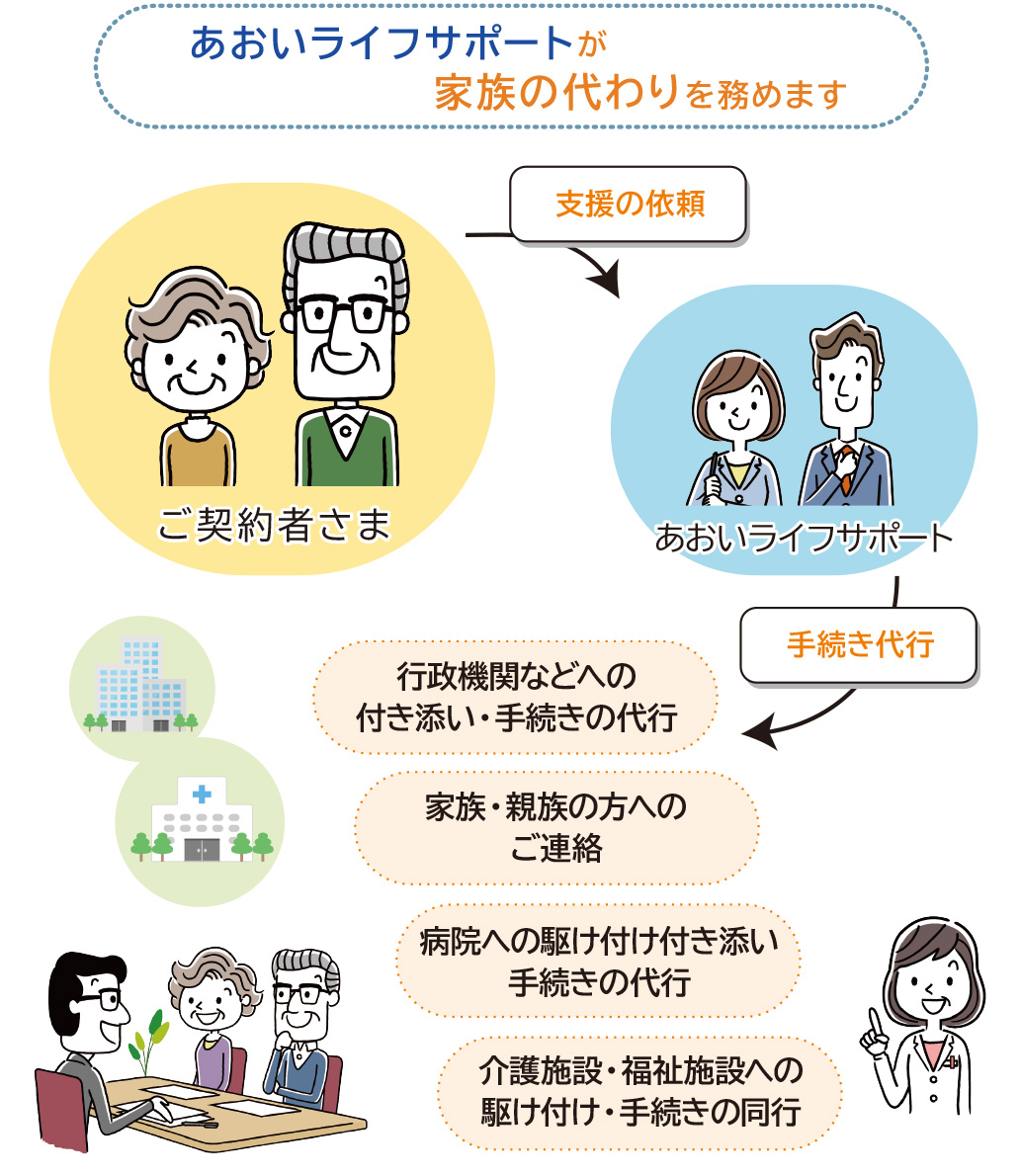 一人暮らしの高齢者・単身者・障がい者の方で、頼れる家族や親族が近くにいない環境の場合、不安に感じることも多いかと思います。そんな方々のために、のびのびライフサポートは家族に代わって行政・病院・福祉施設などと連携をして、ご利用者様が安心した日常生活を送ることができるようにサポートいたします。